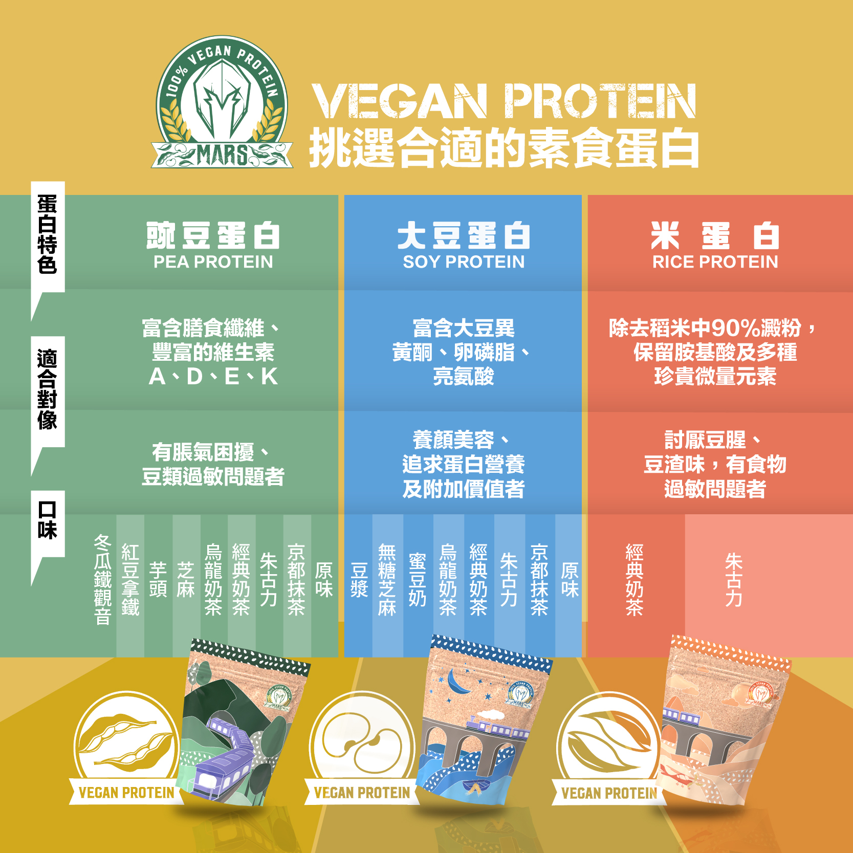 豌豆蛋白、大豆蛋白以及米蛋白,三個不同類別附帶有自己的蛋白特色。