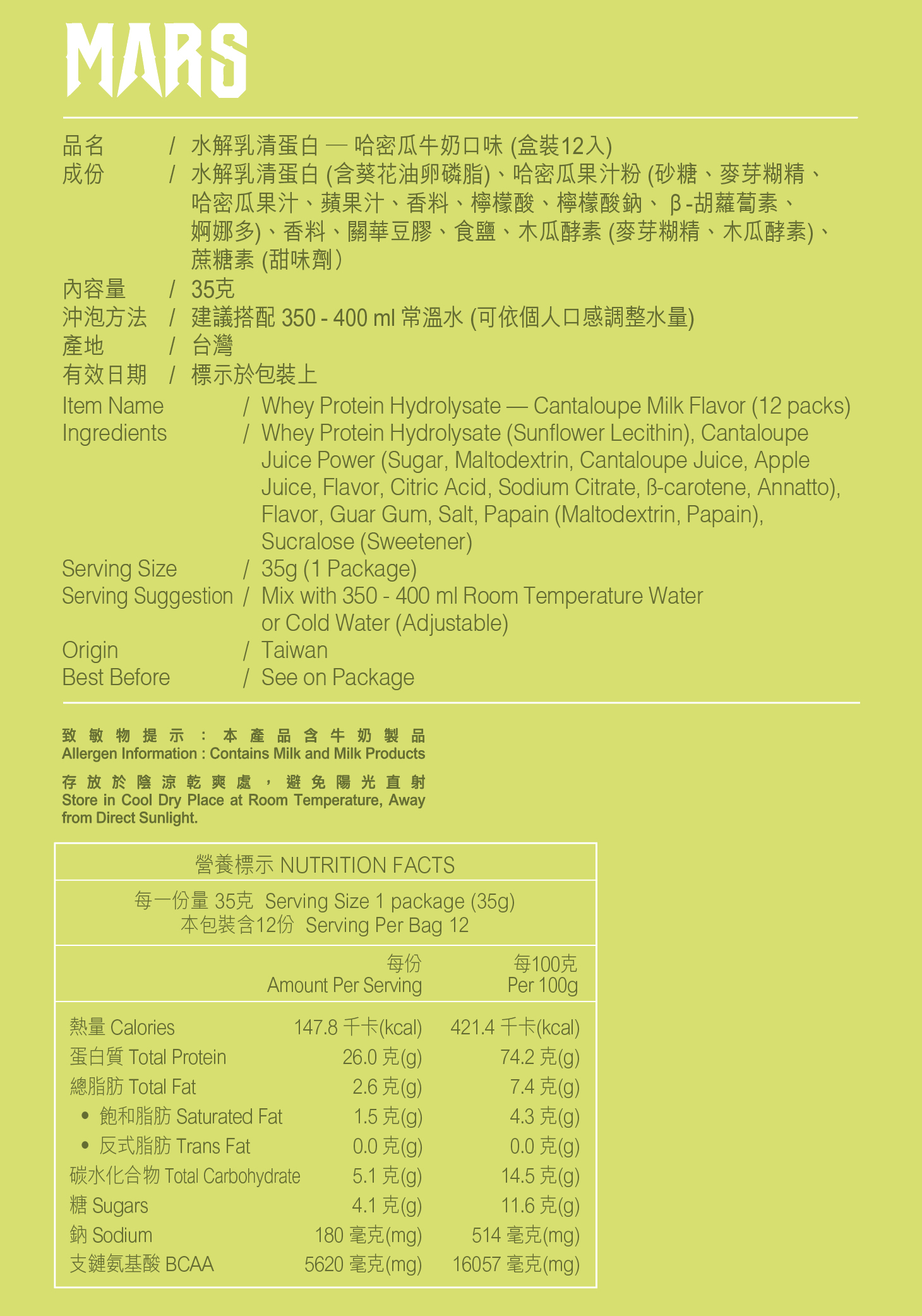 口味清爽,將真正哈密瓜牛奶口味加入蛋白粉中!