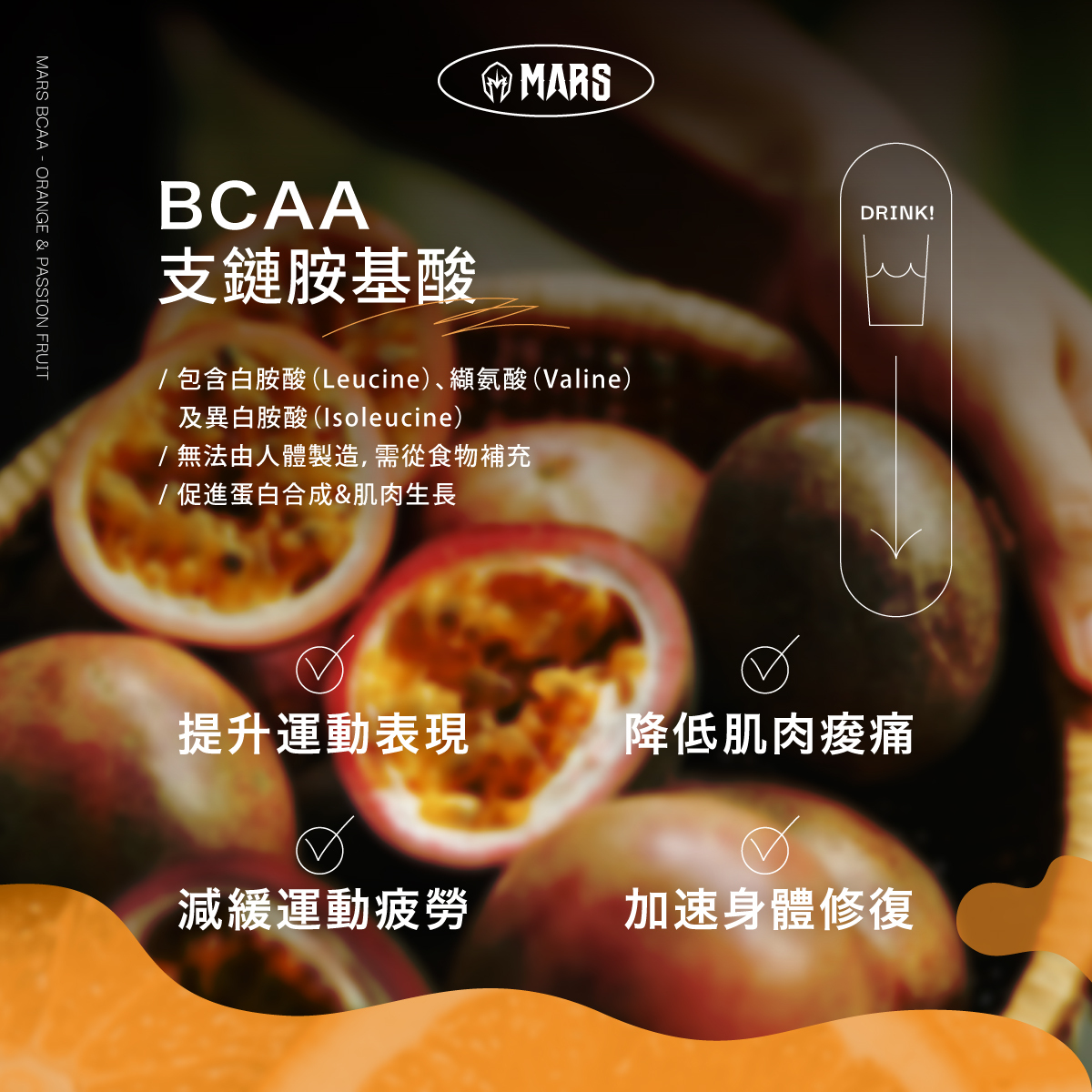 MARS BCAA 全新柳橙百香果口味,甜中帶酸清爽解膩爽度加倍氣泡感。MARS BCAA一向深得運動人士喜愛,當中三種主要的氨基酸,有助肌肉的合成及修護! 特別係比賽期間,助力維持肌肉嘅表現,唔會受乳酸影響! 所以唔怪得一眾運動愛好者都有番一兩包旁身!! 戰神BCAA更加增添電解質及維他命B雜,全方位幫大家時時刻刻補充足夠水份同能量!